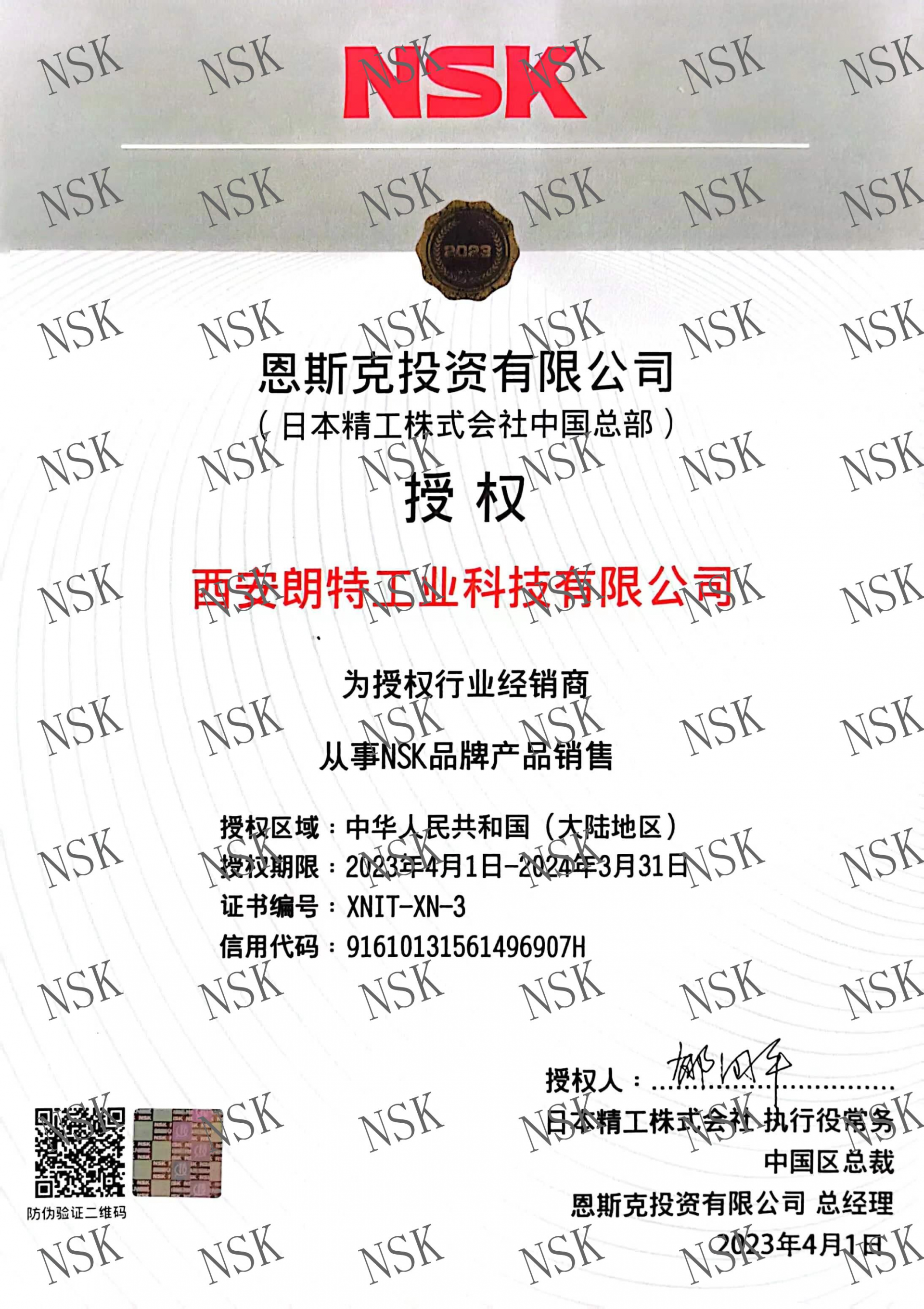 證書介紹 此證書授權西安朗特工業科技有限公司為授權行業經銷商,從事NSK品牌產品銷售。授權區域:中華人民共和國(大陸地區) 授權期限:2023年4月1日-2024年3月31日 證書編號:XNIE-XN-3 證書圖片 |