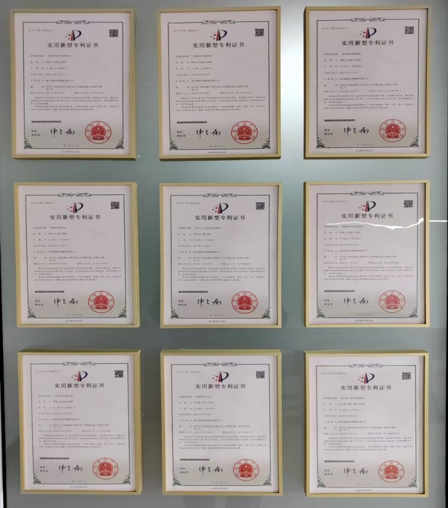 證書介紹 一種防堵塞的多級篩網過濾的分離設備實用新型專利證書; 一種復經平紋密紋網實用新型專利證書; 一種高頻自動錫焊機實用新型專利證書; 一種高效自動旋壓機實用新型專利證書; 一種篩網用旋壓機實用新型專利證書; 一種錫焊機工作臺實用新型專利證書; 一種新型雙層平紋密紋網實用新型專利證書; 一種用于工業流體的試驗篩實用新型專利證書; 一種多層三維徑向編織機實用新型專利證書; 等等...... 證書圖片 |