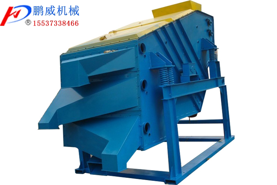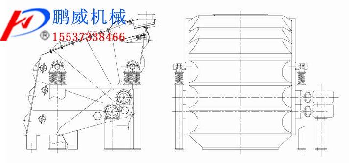 直線概率篩運動軌跡: 概率篩的篩面與普通振動篩一樣作直線振動,可采用雙軸慣性激振器,用兩臺電動機分別帶動。對于體積小、重量輕的概率篩,可作用一對振動電機直接裝在篩箱上激振,兩激振電動機自同步運轉,產生直線振動。由于篩箱和激振器之間的聯接方式不同,故有兩種不同激振系統的激振器:一種是激振器直接固接在篩條止,像普通直線振動篩,這種概率篩是線性振動系統。另一種是激振器安裝在平衡架上,平衡架與篩箱之間是彈性聯接,篩箱用彈簧吊掛,這種概率篩是雙質體振動系統。概率篩基本上都采用帶有彈簧的懸吊裝置,重量輕的小篩分機用圓柱螺旋彈簧直接中吊掛裝置進行調節。根據廠房條件和配置的需要,概率篩也可安裝成座式,和直線振動篩一樣,篩箱通過一組彈簧支承在機座上。 直線概率篩外形圖: