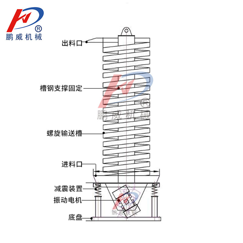 振動(dòng)垂直提升機(jī)是由提升槽、振動(dòng)電機(jī)、減振系統(tǒng)和底座等組成。該系列提升機(jī)是采用振動(dòng)電機(jī)作為振動(dòng)源,固定在提升槽上的兩臺(tái)相同型號(hào)的振動(dòng)電機(jī)中心線交叉一定角度安裝,并做相反方向自同步旋轉(zhuǎn),振動(dòng)電機(jī)所帶的偏心塊在旋轉(zhuǎn)時(shí)各個(gè)瞬間位置所產(chǎn)生的離心力之分力沿拋擲方向作往復(fù)運(yùn)動(dòng),使支承在減振器上的整個(gè)機(jī)體不停振動(dòng),使物料在提升槽內(nèi)被拋起的同時(shí)向上運(yùn)動(dòng),物料落入入料槽后,開始被拋起,此時(shí)可以使物料與空氣充分接觸,還可以起到散熱冷卻的作用。 |