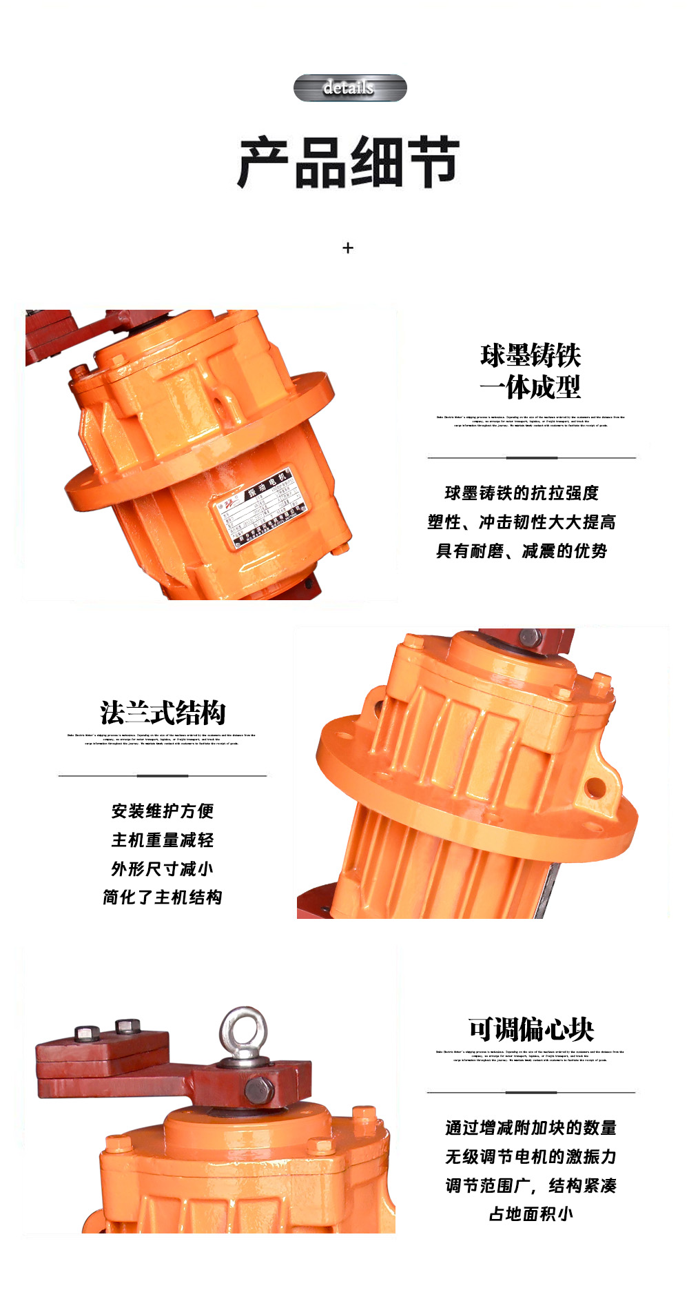 XBL系列法蘭式振動電機立式振動電機是一種專門針對振動篩的運行特性設計的振動電機。它們采用單法蘭結構,這種結構設計精巧,運行安全可靠,具有很高的耐用性。XBL系列振動電機可以完全升級代替老式振子的振動方式,適用于不同類型的振動篩分設備。這些電機的特點包括噪音低、能耗低、效率高、體積小、重量輕、啟動迅速、安裝便捷、維護簡單、壽命長,以及激振力易于無級調整,調節范圍廣,振動無機械傳導.
