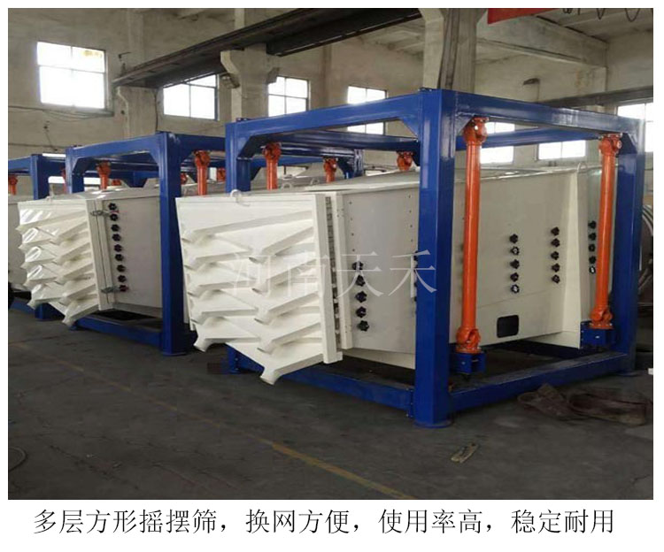 方型搖擺篩是一種具有高精度大產量的篩分設備,它具有自清網效果佳,篩網利用率高壽命長,密封效果好。