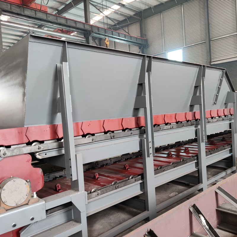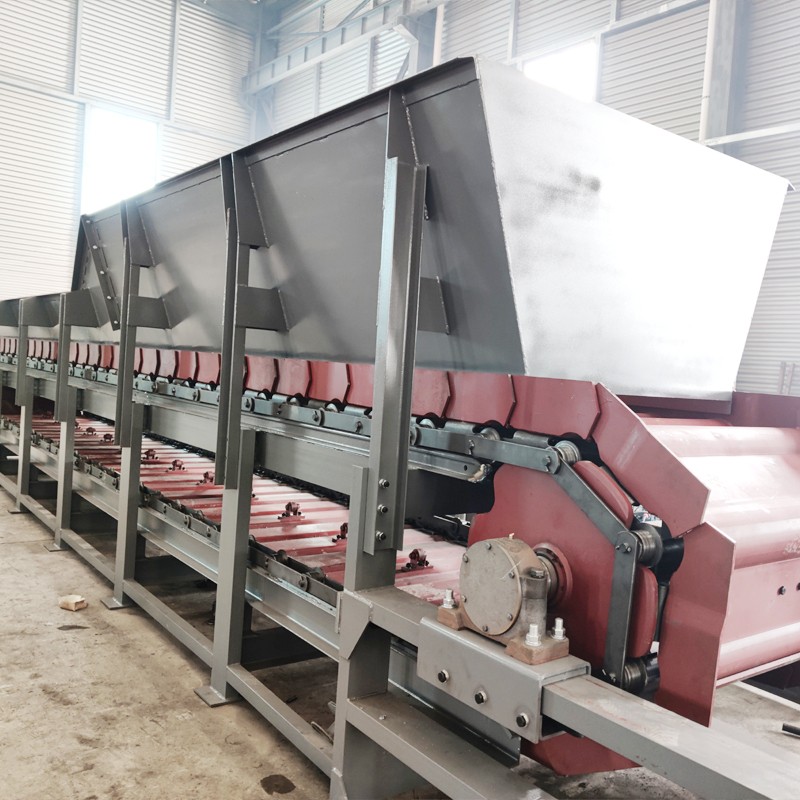 板式給料機由牽引鏈、承載鏈、鏈輪、機架、驅動裝置組成。