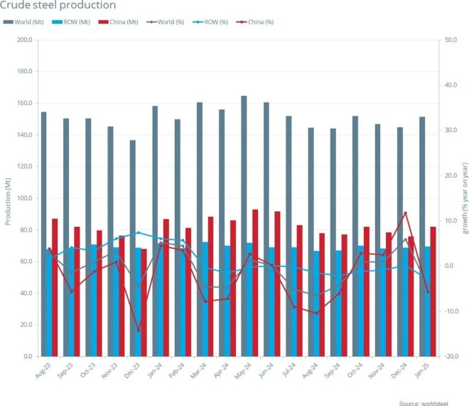 2025年1月全球69個納入世界鋼鐵協(xié)會統(tǒng)計國家/地區(qū)的粗鋼產(chǎn)量為1.514億噸,同比下降4.4%。