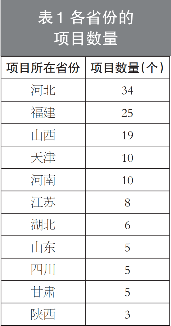 從項目數量來看,河北位居榜首,共涉及34個項目;福建緊跟其后,有25個項目;山西位列第三,共有19個項目;其他省份項目數量分別為天津和河南各10個,江蘇8個,湖北6個,山東、四川和甘肅各5個,陜西3個。