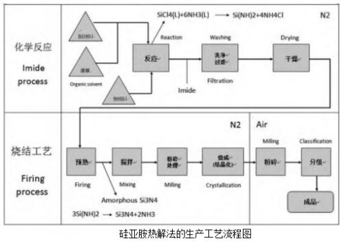 液相反應(yīng)法(又稱硅亞胺化學(xué)分解法)制備的氮化硅粉具有極高的α相含量,并且燒結(jié)活性優(yōu)異。但該方法制備難度大,技術(shù)門檻高,對(duì)原料的純度要求高,其難點(diǎn)在于不易獲得穩(wěn)定的固態(tài)亞氨基硅(Si(NH)2)。目前,這種方法已經(jīng)成為商業(yè)化高純高質(zhì)量氮化硅粉體生產(chǎn)所使用的最主要的方法。日本UBE公司是最早使用該方法規(guī)?;a(chǎn)出性能優(yōu)異、質(zhì)量穩(wěn)定的氮化硅粉體產(chǎn)品的廠商。