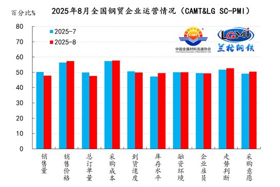 中國(guó)金屬材料流通協(xié)會(huì)、蘭格鋼鐵網(wǎng)聯(lián)合發(fā)布的2025年8月份中金協(xié)&蘭格鋼鐵網(wǎng)·鋼鐵流通PMI指數(shù)為49.8%,與上月持平,維持在收縮區(qū)間內(nèi)。從分類指數(shù)看,構(gòu)成中金協(xié)&蘭格鋼鐵網(wǎng)·鋼鐵流通PMI的10個(gè)分類指數(shù)5升5降,其中銷售價(jià)格、采購(gòu)成本、庫(kù)存水平、走勢(shì)判斷和采購(gòu)意愿5項(xiàng)指數(shù)上升,而銷售量、總訂單量、到貨速度、融資環(huán)境和企業(yè)雇員5項(xiàng)指數(shù)下降。