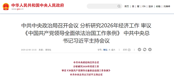 12月8日,中共中央政治局召開會議,分析研究2026年經濟工作,審議《中國共產黨領導全面依法治國工作條例》。中共中央總書記習近平主持會議。