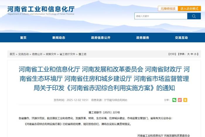 近日,河南省工業(yè)和信息化廳聯(lián)合省發(fā)展改革委、財政廳、生態(tài)環(huán)境廳、住房城鄉(xiāng)建設廳、市場監(jiān)督管理局等六個部門,正式印發(fā)了《河南省赤泥綜合利用實施方案》(豫工信聯(lián)節(jié)〔2025〕223號)。