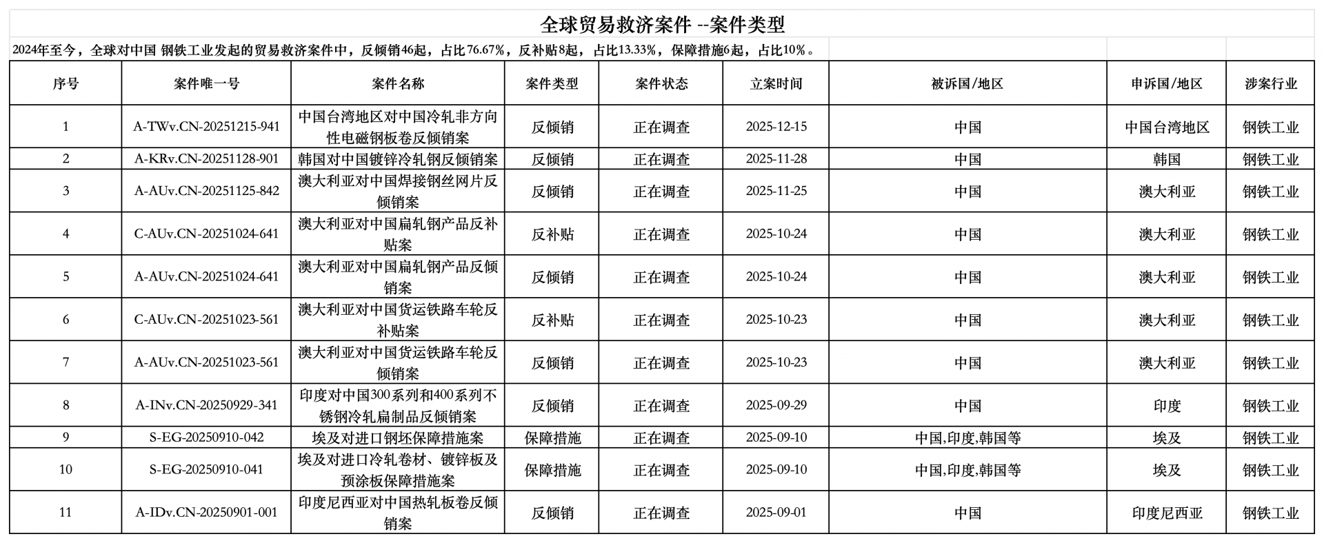 增長的出口量也持續引發國際貿易摩擦。中國貿易救濟信息網數據顯示,2024年至今,全球對中國鋼鐵工業發起的貿易救濟案件中,反傾銷46起,占比76.67%。