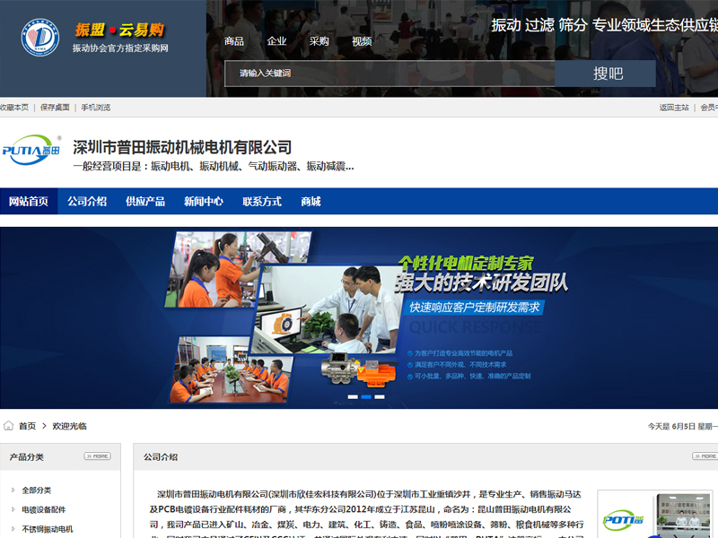 深圳市普田振動電機有限公司(深圳市欣佳宏科技有限公司)位于深圳市工業重鎮沙井,是專業生產、銷售振動馬達及PCB電鍍設備行業配件耗材的廠商,其華東分公司2012年成立于江蘇昆山,命名為:昆山普田振動電機有限公司,我司產品已進入礦山、冶金、煤炭、電力、建筑、化工、鑄造、食品、噴粉噴涂設備、篩粉、糧食機械等多種行業,同時我司產品通過了CE以及CCC認證,并通過國際外觀專利申請,同時以“普田、PUTA”注冊商標。 本公司以科技開發為先導,引進的設備、獨特的工藝、完善的檢測手段和科學的質量控制,國外技術,結合國內產品需求實情。輔以我司專業技術人員的精心研制、以滿足不同客戶的需要,且產品贏得了廣大用戶的一致好評。