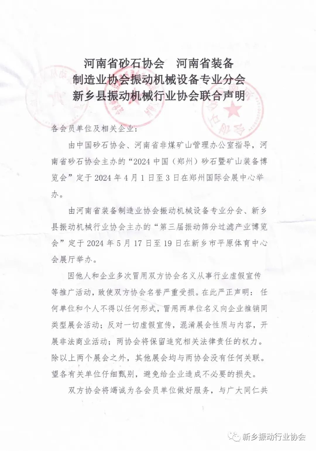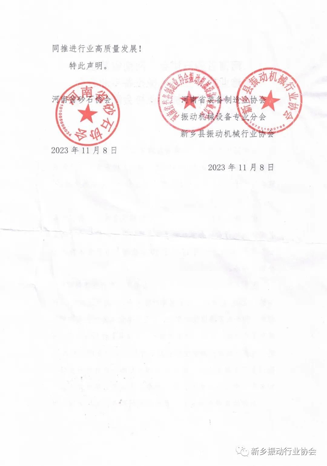 河南省砂石協會 河南省裝備制造業協會振動機械設備專業分會 新鄉縣振動機械行業協會聯合聲明
