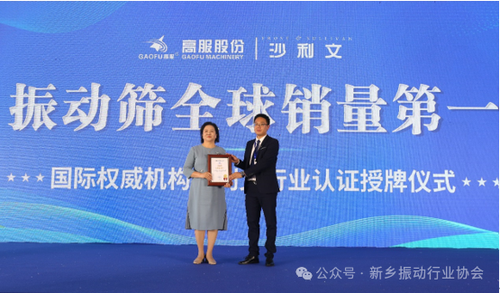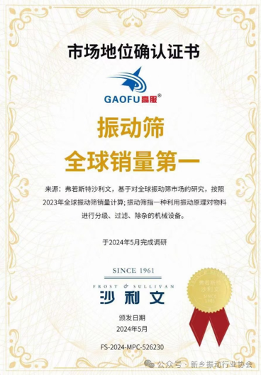 5月17日在河南·新鄉舉行的中原農谷第二屆振動機械產業博覽會上,新鄉市高服機械股份有限公司(以下簡稱“高服機械”)榮獲了由國際權威認證機構弗若斯特沙利文(frost Sullivan)頒發的“振動篩全球銷量第一”的市場地位確認證書。這一認證標志著高服機械在振動篩領域的領先地位得到了國際權威機構的正式認可,同時也反映了公司在技術創新、產品質量、客戶服務等方面的卓越表現。