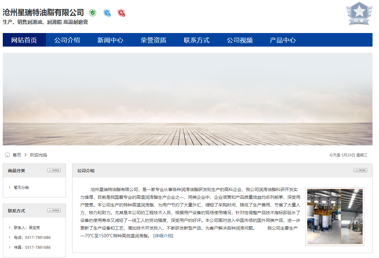 滄州星瑞特油脂有限公司,是一家專業從事各種潤滑油脂研發和生產的高科企業,我公司潤滑油脂科研開發實力雄厚,目前是我國最專業的高溫潤滑脂生產企業之一,同類企業中,企業信譽和產品質量效益均名列前茅,深受用戶贊譽。本公司生產的特種高溫潤滑脂,為用戶節約了大量外匯,縮短了采購時間,降低了生產費用,節省了大量人力、物力和財力。尤其是本公司的工程技術人員,根據用戶設備的現場使用情況,針對性調整產品技術指標即延長了設備的使用壽命又減輕了一線工人的勞動強度,深受用戶的好評。本公司面對進入中國市場的國外同類產品,進一步更新了生產設備和工藝,增加技術開發投入,不斷研發新型產品,為客戶解決各種潤滑問題。 我公司主要生產—70℃至1500℃特種高低溫潤滑脂。