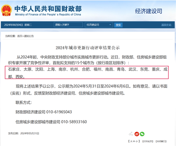 2024年5月31日,住建部、財政部聯合發布《2024年城市更新行動評審結果公示》。從2024年起,中央財政支持部分城市實施城市更新行動,首批擬支持的15個城市為(按行政區劃排序):石家莊、太原、沈陽、上海、南京、杭州、合肥、福州、南昌、青島、武漢、東莞、重慶、成都、西安。
