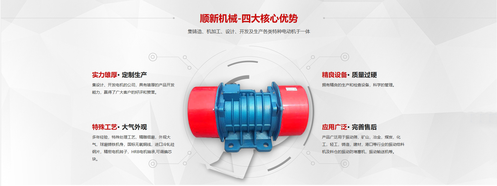公司主要生產(chǎn)YZS系列振動(dòng)電機(jī),VB振動(dòng)電機(jī),側(cè)板振動(dòng)電機(jī)、ZFB倉(cāng)壁振動(dòng)器等系類(lèi)產(chǎn)品及配件生產(chǎn)。產(chǎn)品廣泛用于振動(dòng)篩,礦山,冶金,煤炭,化工,輕工,鑄造,建材,港口等行業(yè)的振動(dòng)給料機(jī)及料倉(cāng)的振動(dòng)防堵塞機(jī),振動(dòng)輸送機(jī)等;