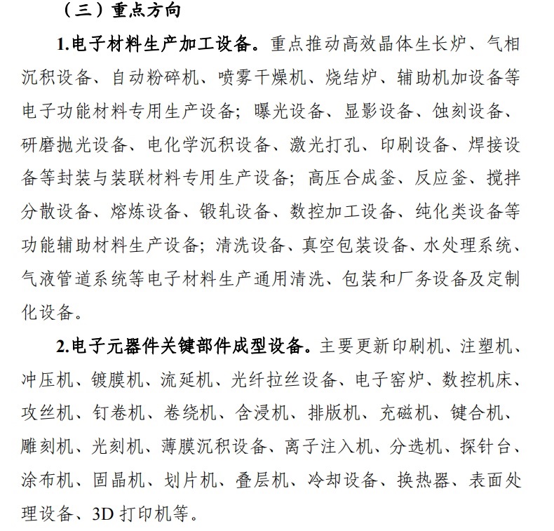 重點方向包括電子材料生產加工設備、電子元器件關鍵部件成型設備、電子元器件加工組裝設備、電子元器件與材料先進檢測設備、工業操作系統、工業軟件。