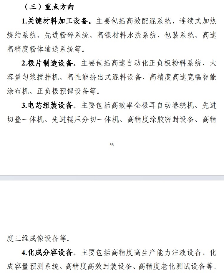 重點方向包括:關鍵材料加工設備、極片制造設備、電芯組裝設備、化成分容設備、系統集成設備等。