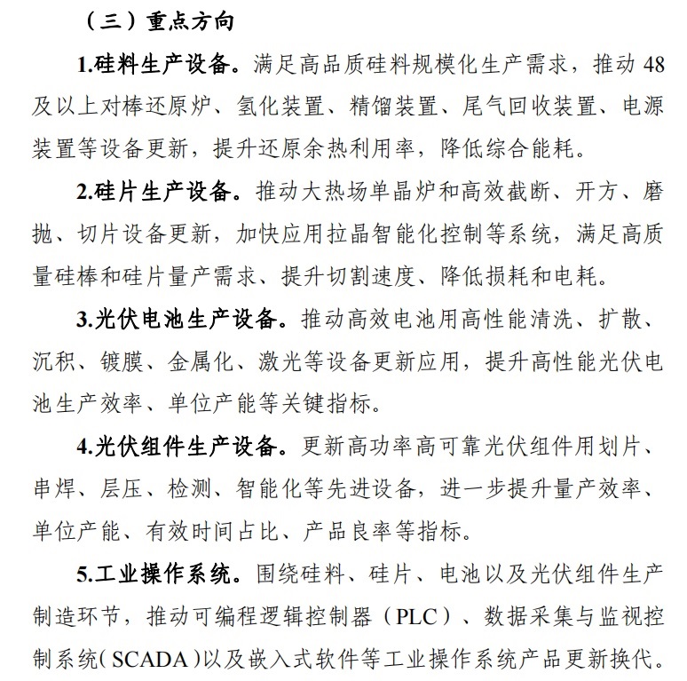 對于光伏行業,以產線升級和提升高端化、智能化、綠色化發展水平為重點,重點更新改造多晶硅、硅片、電池、組件等主要環節關鍵設備,提升設備生產效率、良率、單體規模和產品性能、穩定性、一致性、可靠性,促進構建適應能源轉型需求的現代化光伏產業體系和新能源基礎設施網絡。到2027年,光伏產業關鍵環節智能制造、綠色制造水平大幅提升,量產效率、產品良率等性能持續提升,電耗、水耗等能耗指標明顯降低,市場主流電池、組件等產品效率提高5%以上。
