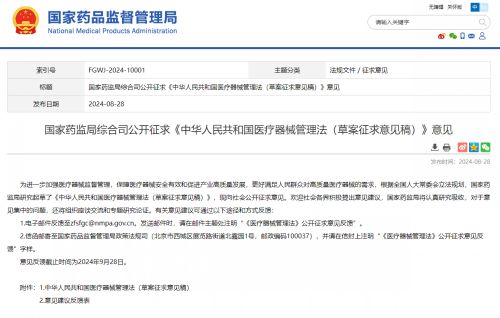 8月28日晚,據國家藥品監督管理局網站消息,近日,國家藥監局綜合司公開征求《中華人民共和國醫療器械管理法(草案征求意見稿)》意見。意見反饋截止時間為9月28日。