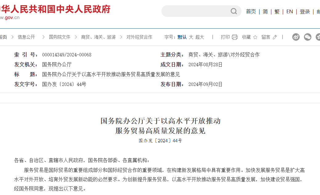 中國粉體網訊9月2日,人民政府網消息,國務院辦公廳日前印發《關于以高水平開放推動服務貿易高質量發展的意見》,《意見》提出5方面20項重點任務。