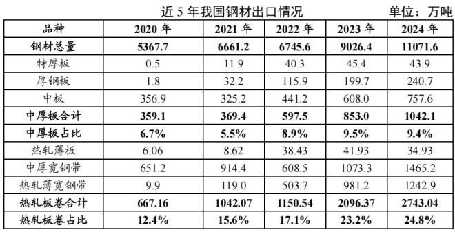近五年,我國鋼材出口量持續(xù)增長態(tài)勢。2024年,我國鋼材出口總量達(dá)到11071.55萬噸,同比增長22.7%,較2020年增長106.3%。其中,2024年中厚板出口總量1042.10萬噸,同比增長22.2%,占出口鋼材總量的9.4%;熱軋板卷出口總量2743.04萬噸,同比增長30.8%,占出口鋼材總量的24.8%。
