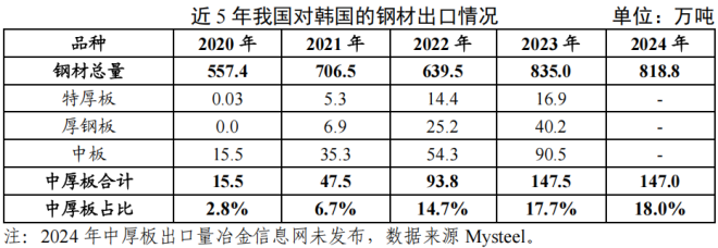 近五年,我國對韓國的鋼材出口呈波動增長態(tài)勢,其中中厚板占比呈穩(wěn)定增長態(tài)勢。2024年,我國對韓國的鋼材出口總量818.75萬噸,同比下降1.9%,較2020年增長46.9%;其中,對韓中厚板出口量147萬噸,同比基本持平,但比2020年增長846.6%;占出口韓國鋼材總量的18%,占我國中厚板出口量的14.1%。